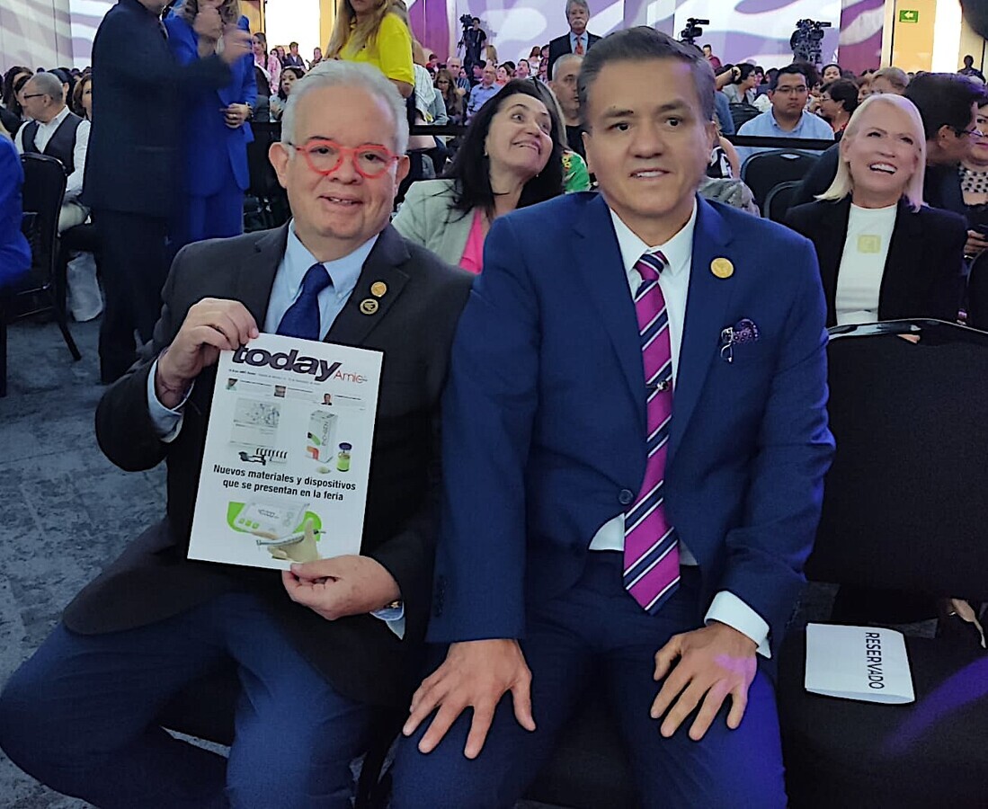 El actual presidente de la Asociación Dental Mexicana, Dr. Sergio Curiel, con Jaime Edelson, expresidente de ADM, quien sostiene un ejemplar de "Today" durante la ceremonia de apertura del congreso científico.