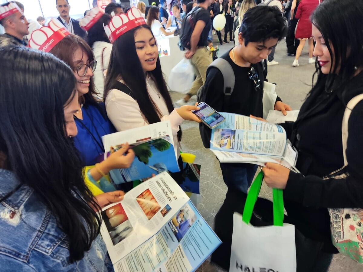 Un grupo de estudiantes de odontología lee el periódico de ferias de Dental Tribune, mientras otra escanea el código de los cursos que ofrece la universidad UIC-Barcelona.