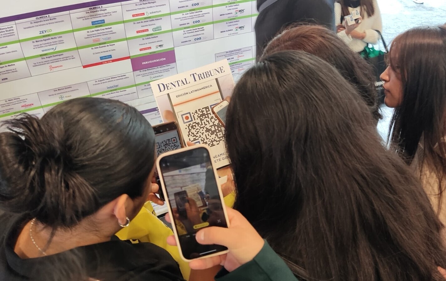Un grupo de estudiante escanea el código QR para suscribirse gratuitamente a Dental Tribune, mediante lo cual reciben las newsletters semanales de esta publicación internacional.