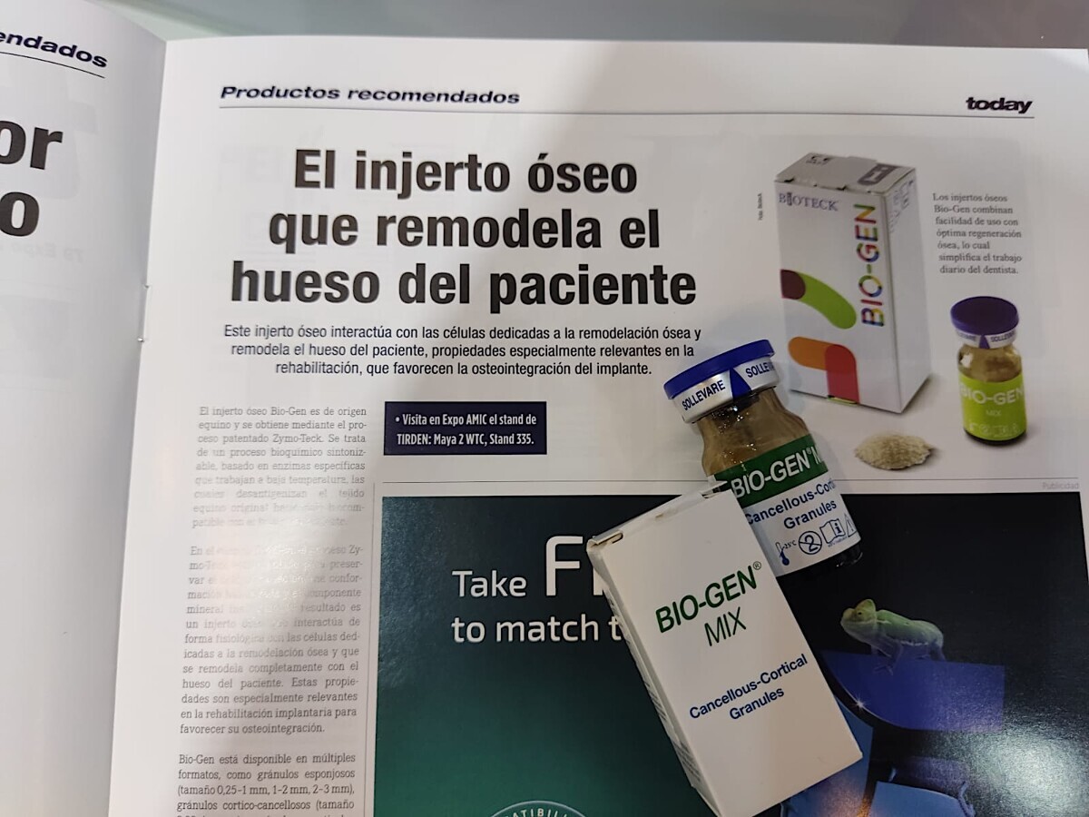 El artículo sobre el revolucionario injerto óseo Bio-Gen publicado en "Today", junto a una muestra del producto real en el stand de Tirden, su distribuidor en México.