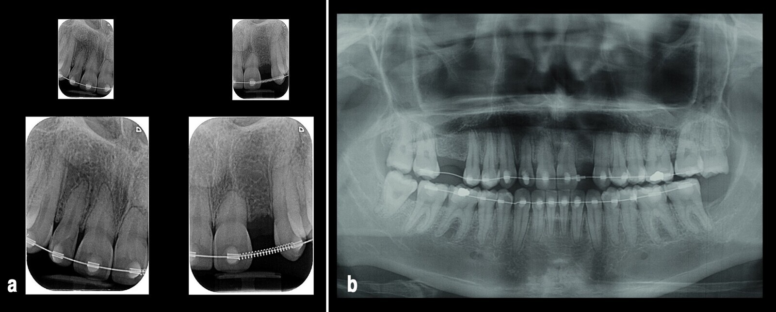 Figura 6. Los dientes con acortamiento radicular pueden ser tratados efectivamente (a), como demuestra el control radiográfico de progreso del tratamiento (b).