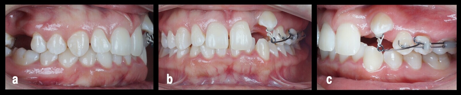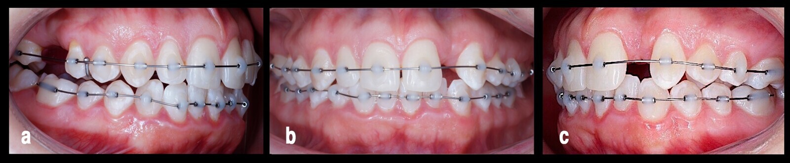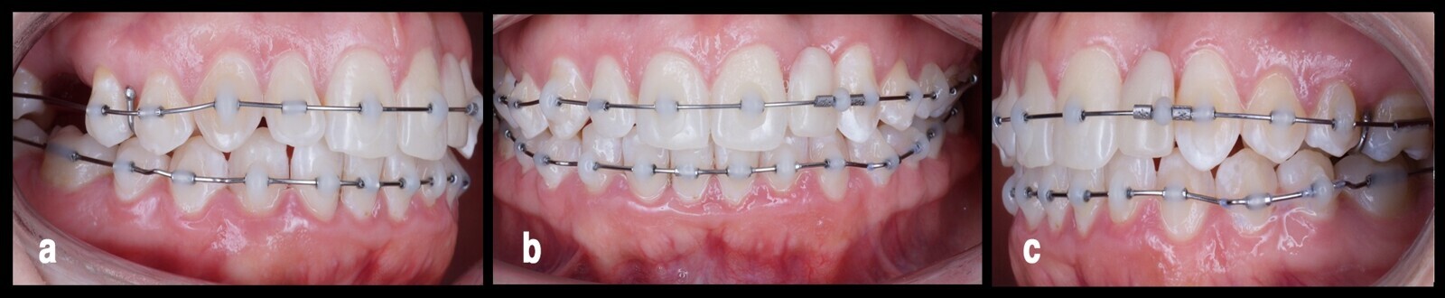 Figura 5. El tratamiento del arco inferior, después de conseguir una adecuada nivelación y corrección de la sobremordida en el arco superior desde tres vistas (a, b, c).