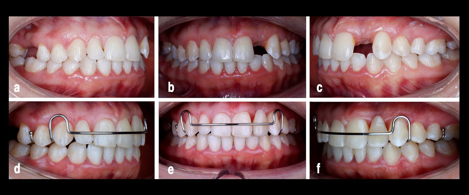 Figura 9. El sistema de ortodoncia utilizado logró el espacio ideal para la posterior rehabilitación oral del diente 22 que se muestra en tres vistas (a, b, c). El tratamiento se finalizó con resultados aceptables con uso del retenedor, como se puede observar en tres proyecciones (d, e, f), tal como quería la paciente.