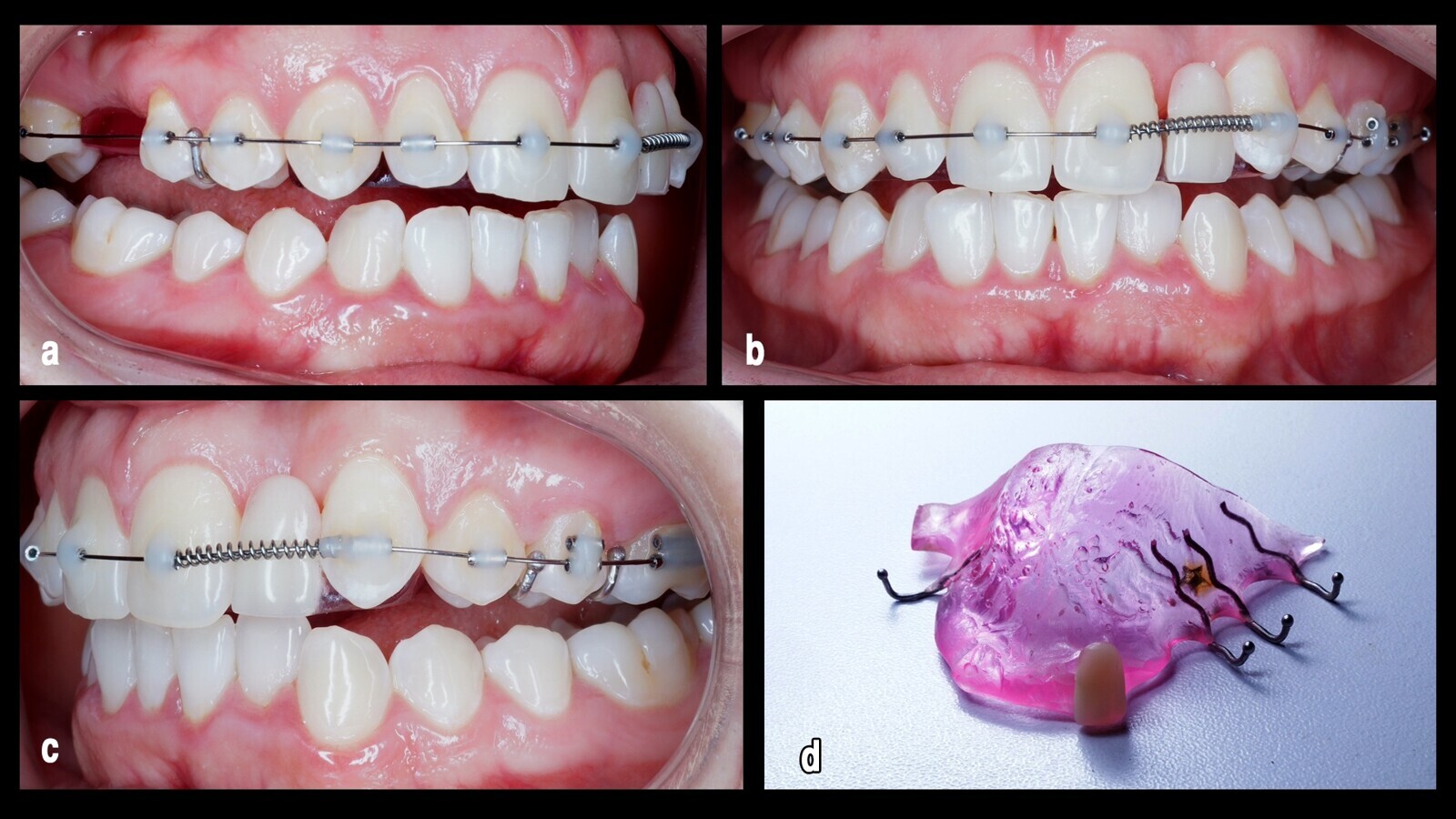 Figura 4. Fase de nivelación, vista desde tres perspectivas distintas (a, b, c), donde se usó un plano de mordida anterior removible con diente temporal a nivel del 22 (d) para mejorar la estética del sector anterior.