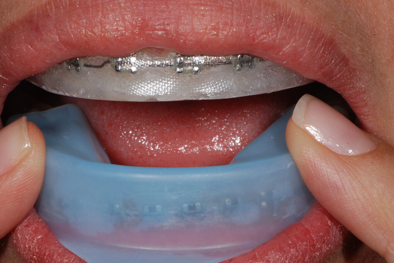 Figura 4. Tratamiento de aclaramiento dental con férulas prefabricadas y predosificadas con peróxido de hidrógeno en una paciente con brackets.