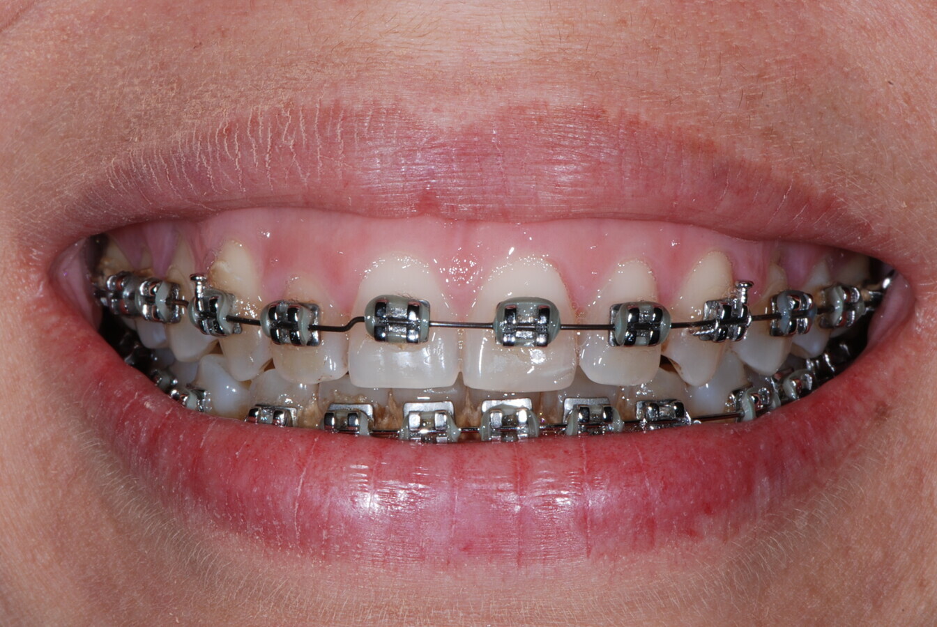 Figura 1. Paciente con ortodoncia fija que presenta acumulación de placa y lesiones blancas.