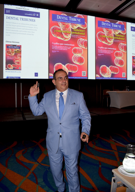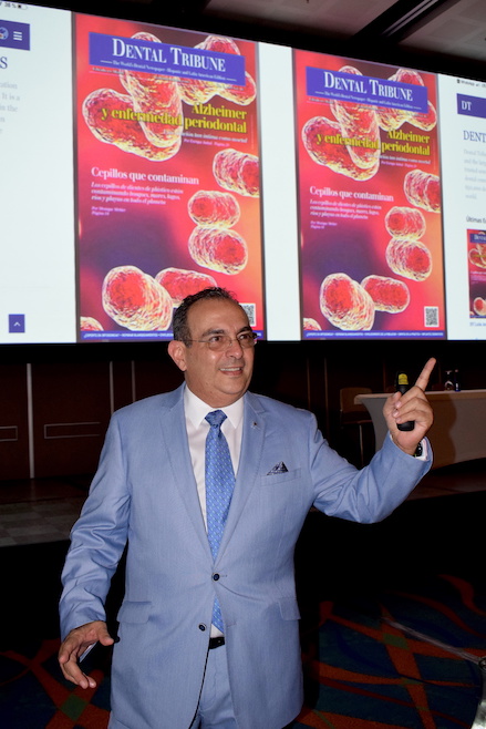 GRAN IMPACTO. El Dr. Enrique Jadad mostró, durante su conferencia en el reciente Congreso Internacional de la Asociación Colombiana de Prostodoncia, la Edición de Septiembre 2019 de Dental Tribune, donde aparece en Portada su artículo sobre la relación entre Alzheimer y enfermedad periodontal. (Foto: Richard Almario)
