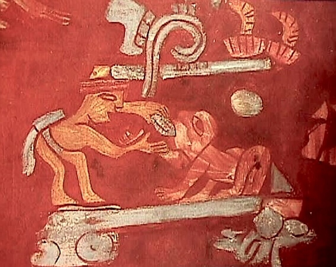Fragmento del Mural de Tepantitla donde aparece un personaje teotihuacano haciendo, según la interpretación del Dr. Samuel Fastlicht y el dibujo Miguel Covarrubias, un “limado dental”.