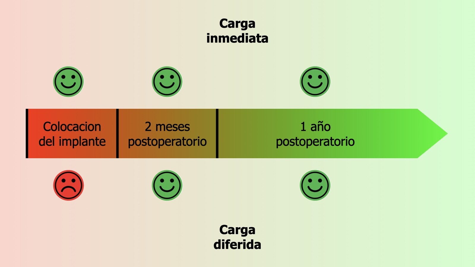 La literatura existente proporciona evidencia limitada sobre la efectividad comparativa de la carga inmediata y diferida del implante. Los estudios han demostrado que los pacientes tienen un excelente nivel de satisfacción con la carga inmediata y que el protocolo es generalmente bien tolerado cuando se realiza un cuidadoso manejo pre, intra y postoperatorio. Sin embargo, las prótesis de carga retardada y de barra también son eficaces y bien toleradas por los pacientes.