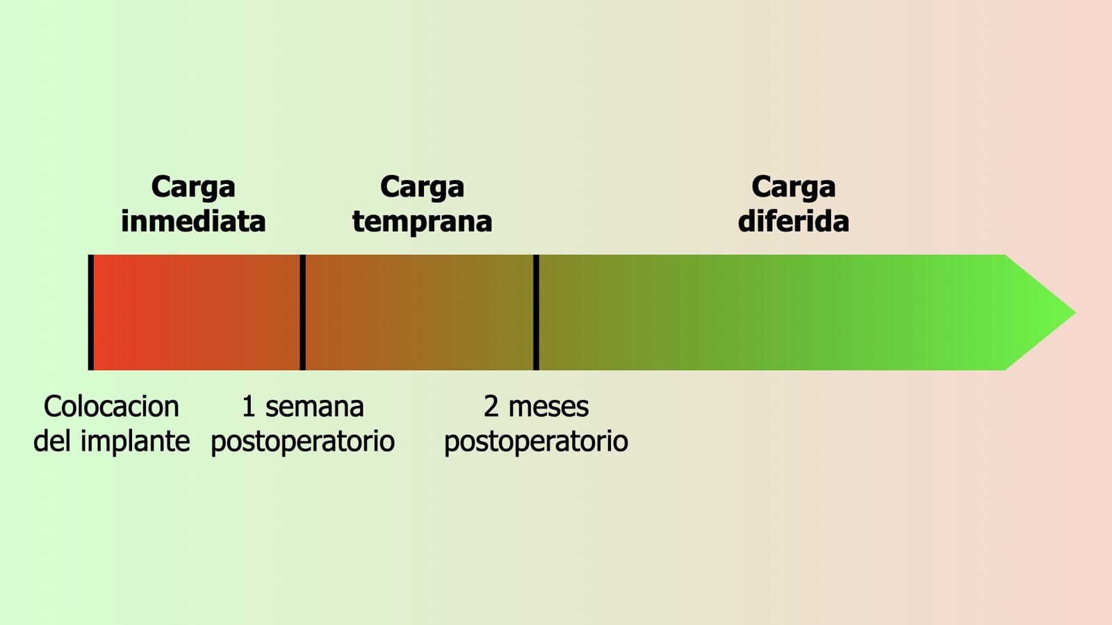 Para lograr la osteointegración, Brånemark et al. sugirieron que la carga del implante debería realizarse 3 meses después para la mandíbula y 6 meses después para el maxilar. La investigación científica se podría reducir el tiempo de curación. En 2008, la reunión de consenso del ITI definió así los tiempos de carga de los implantes (Figura 1):