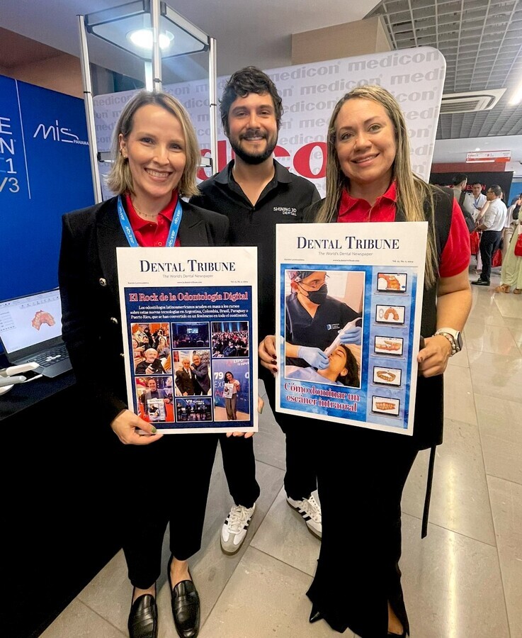 María de Spinali, Decana de la Universidad Latina de Panamá; Luis Vega, Decano de la Universidad de Panamá y Luzkarin Molina, Directora de la Escuela de Odontología de la Universidad Interamericana de Panamá, muestran ejemplares de Dental Tribune durante el Congreso Interuniversidades de Odontología. Fotos: Dental Tribune