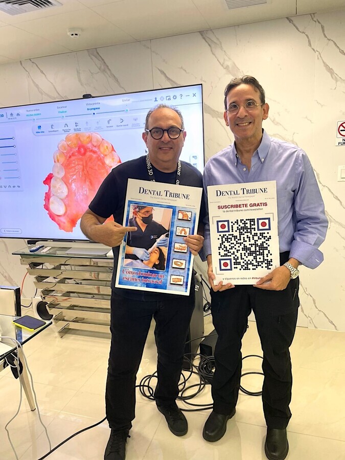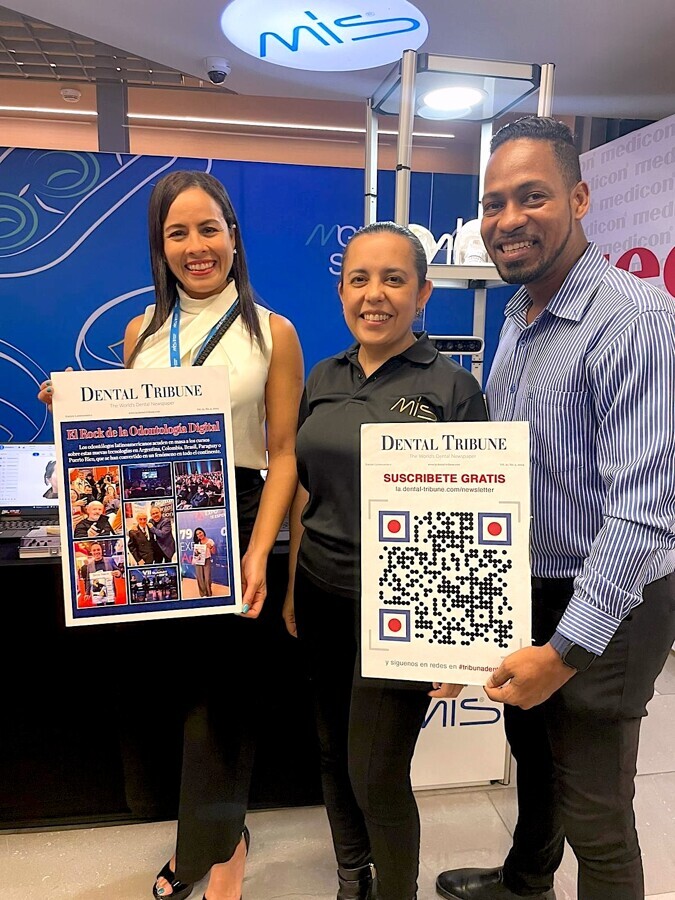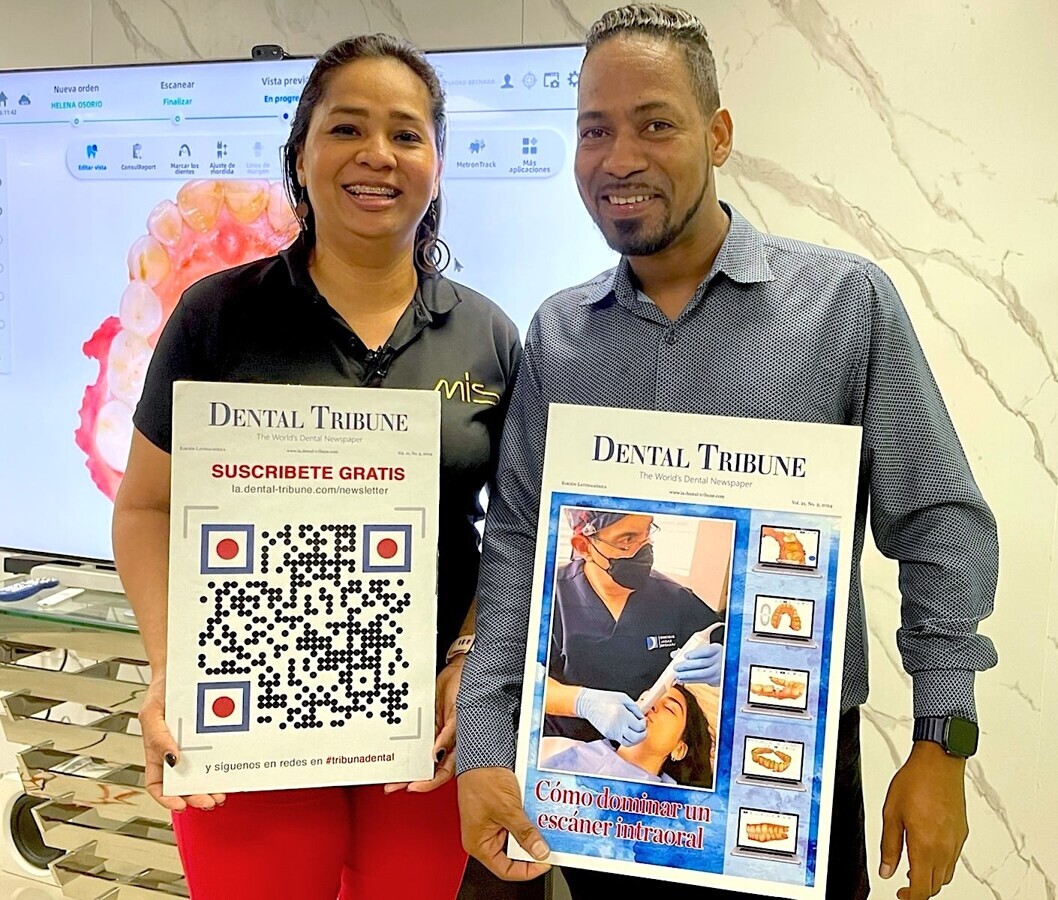 Amed Davis y María Rivera, de MIS Panamá, muestran un ejemplar de Dental Tribune y el código QR para suscribirse gratuitamente a la publicación.