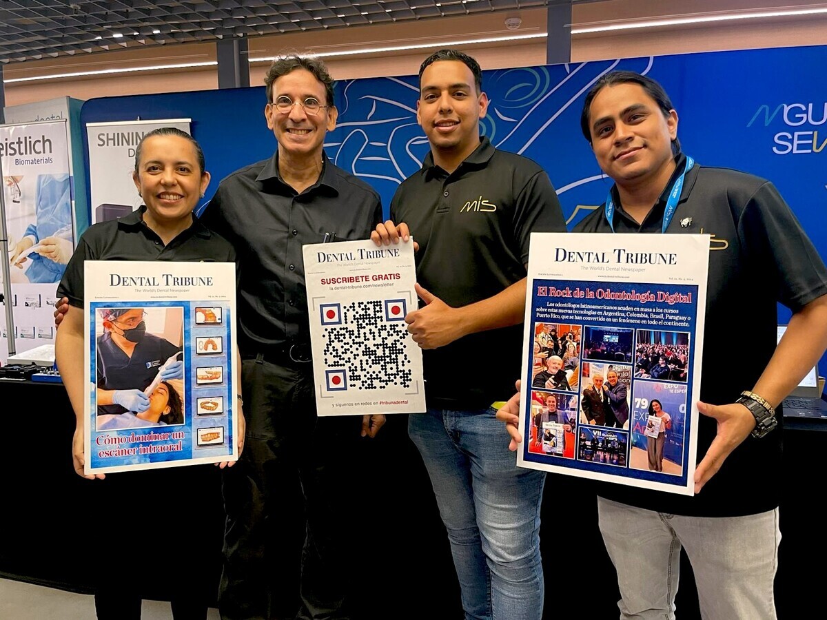 Adriana de Esquivel, Guido Esquivel, Livan Márquez y Rubén Trejos con las portadas de Dental Tribune.