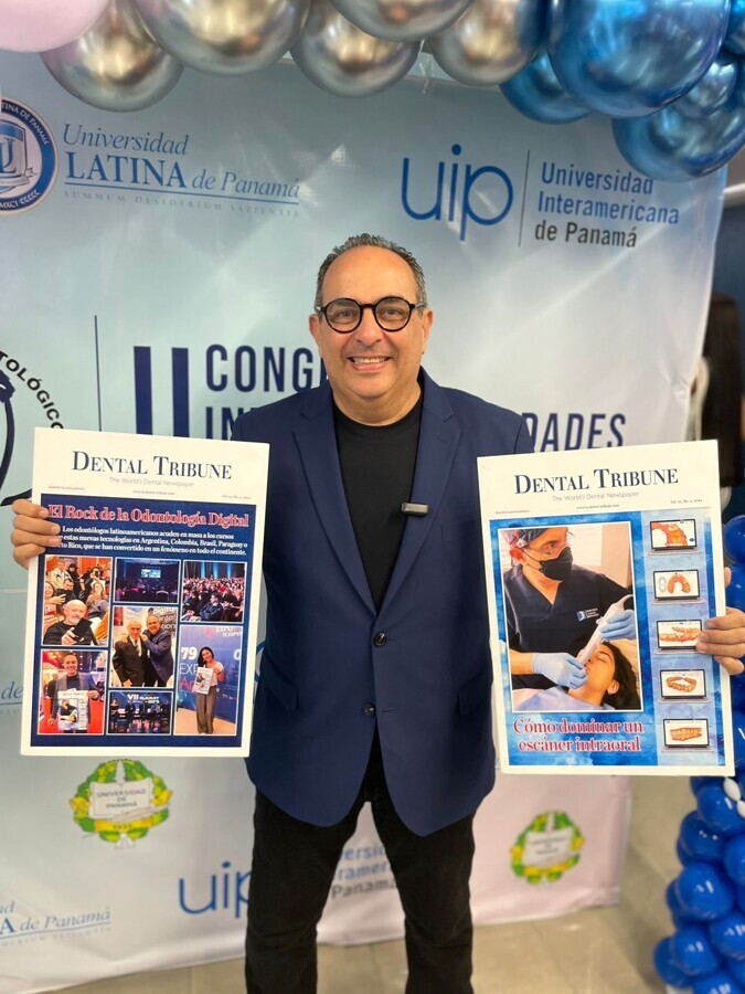 El Dr. Enrique Jadad, conferencista principal del Congreso Interuniversidades de Odontología, sostiene dos portadas de Dental Tribune de 2024.