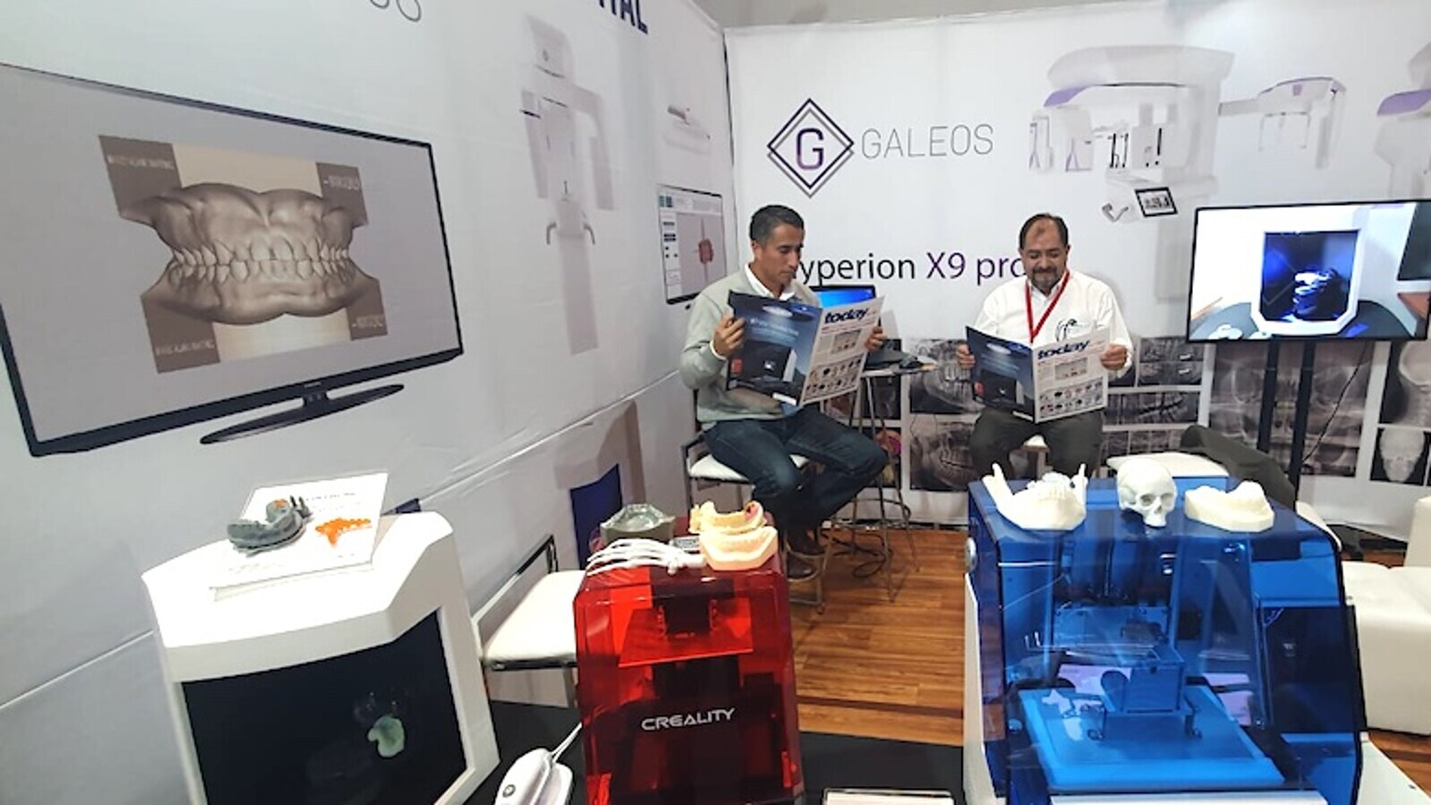 Los directivos de la empresa Galeos, que distribuye los panorámicos de MyRay en México como la línea Hyperion, revisan atentamente el periódico "today" en su stand.