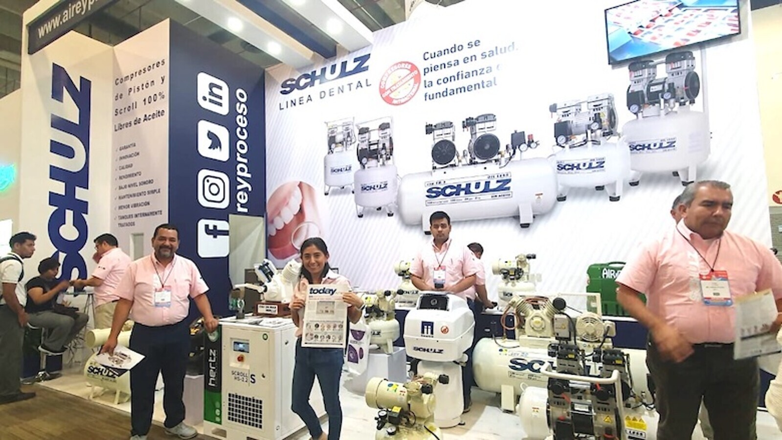 En el stand de los compresores Schulz el personal se siente feliz de tener el periódico de ferias de Dental Tribune.