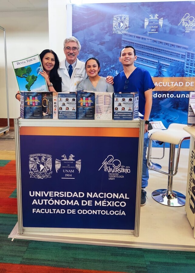 El Dr. Enrique Edwards, Director de Servicios Audiovisuales de la UNAM (con bata blanca), en el stand de la universidad en la 79 Expo AMIC Dental.