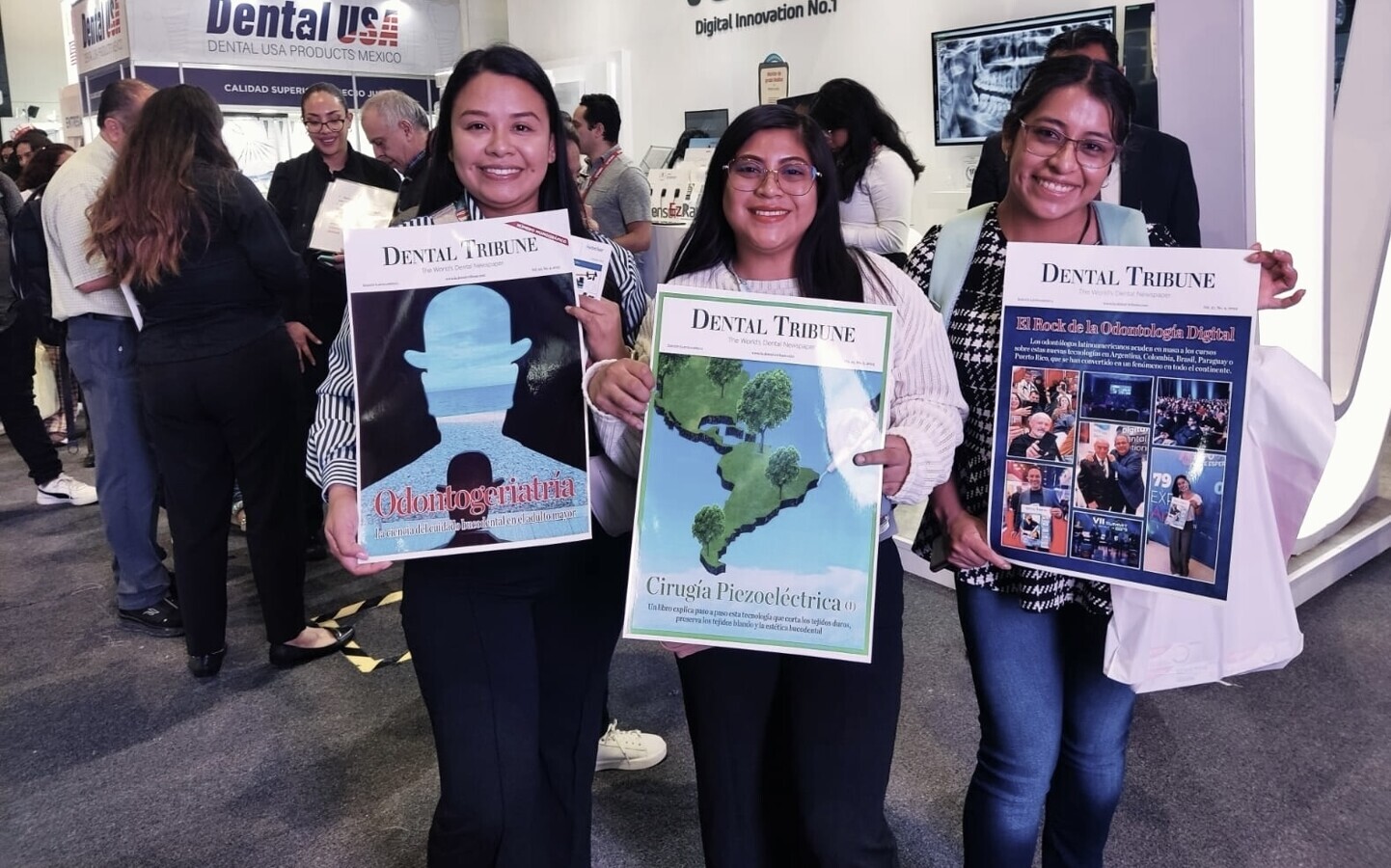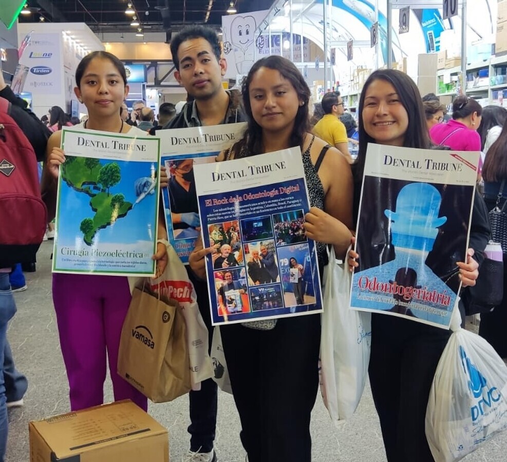 Un grupo de estudiantes de odontología muestran varias portadas de Dental Tribune Latinoamérica dedicadas a piezocirugía, odontopediatría y técnicas de escaneado en la 79 Expo AMIC Dental, donde esta editorial distribuyó también "Today", su periódico de ferias.