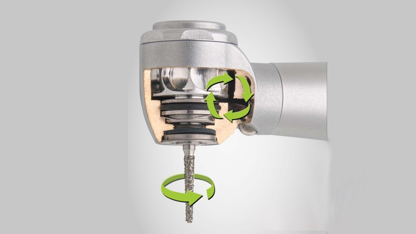 Los procedimientos de preparación a alta velocidad requieren un enfriamiento adecuado del área de contacto entre el instrumento rotativo y el diente. En especial, el calor generado durante la reducción gruesa de la estructura del diente puede provocar graves daños térmicos a los dientes vitales. Por tanto, los contra-ángulos dentales de alta velocidad, idealmente, incluyen un sistema multidireccional de pulverización de agua con 3, 4 o 5 boquillas dirigidas hacia la punta de la fresa. El beneficio es que la capacidad de corte de los instrumentos rotativos se mantiene porque la pulverización de agua elimina la suciedad del área de desbaste de la fresa.