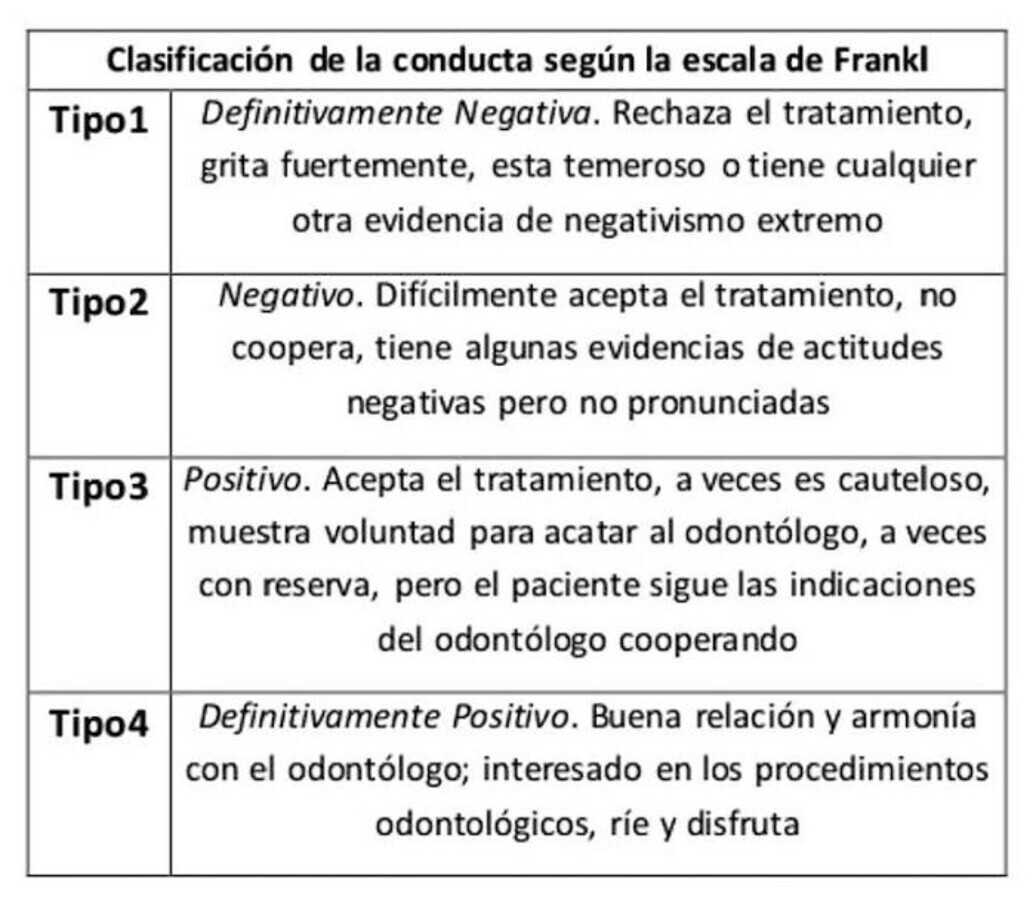 En los dos casos se comparó: el tiempo de trabajo, la calidad de la obturación del conducto, la facilidad del operador durante la instrumentación y el comportamiento del niño. El tiempo de trabajo se cronometró desde que se introdujo la primera lima hasta la ultima irrigación. La calidad de la obturación fue evaluada en la radiografía final y se calificó como: supraobturado, subobturado o con gaps. Con respecto a la facilidad del operador con el sistema de limas asignado, se le preguntó al operador al finalizar el tratamiento si le había resultado un procedimiento: muy difícil, difícil, fácil o muy fácil. El comportamiento del niño fue clasificado mediante la escala de Frankl (Figura 3). En relación con el comportamiento del niño es importante mencionar que fueron niños que habían visitado anteriormente y se había valorado su comportamiento mediante la escala de Frankl en otros tratamientos conservadores.
