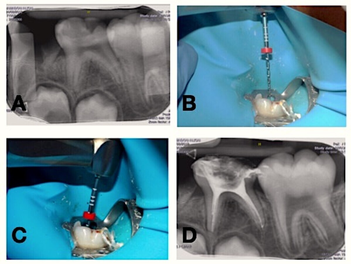 Figura 2. Procedimiento con técnica reciprocante. A: radiografía periapical inicial. B y C: imagen clínica de la instrumentación con lima Reciproc blue R25. D: radiografía periapical final.