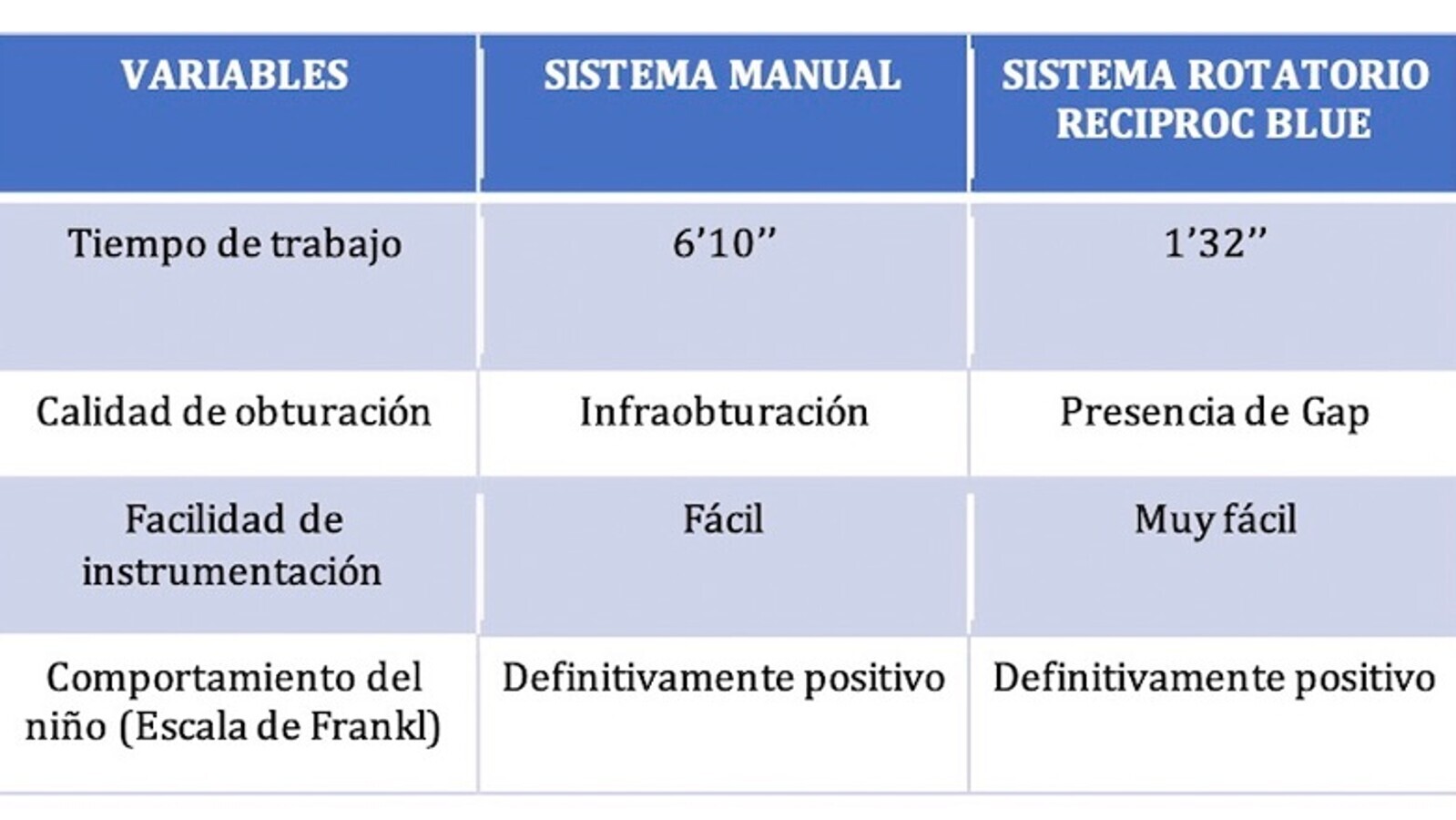 El tiempo de trabajo para el sistema manual fue de 6’10’’ y para el sistema reciprocante de 1’32’’. La calidad de obturación fue buena en las dos técnicas. Respecto a la facilidad de la instrumentación, se encontró “fácil” para el sistema manual y “muy fácil” para el sistema reciprocante y el comportamiento del niño fue en ambos casos “definitivamente positivo”.