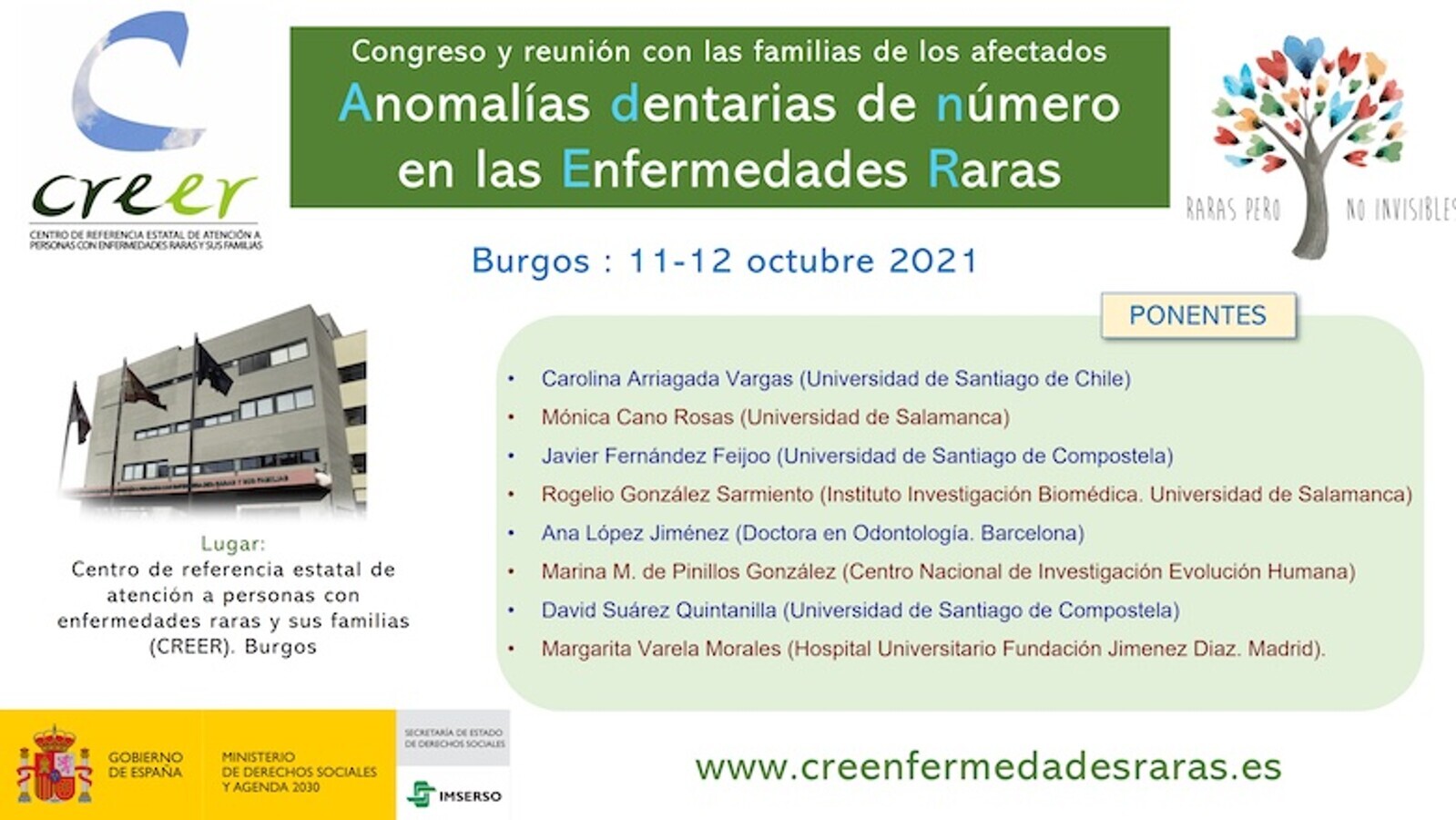 El Centro Estatal de Enfermedades Raras (CREER) de Burgos, España, será la sede de un congreso sobre AGENESIAS DENTARIAS y su relación con las enfermedades raras, el lunes 11 de octubre próximo.