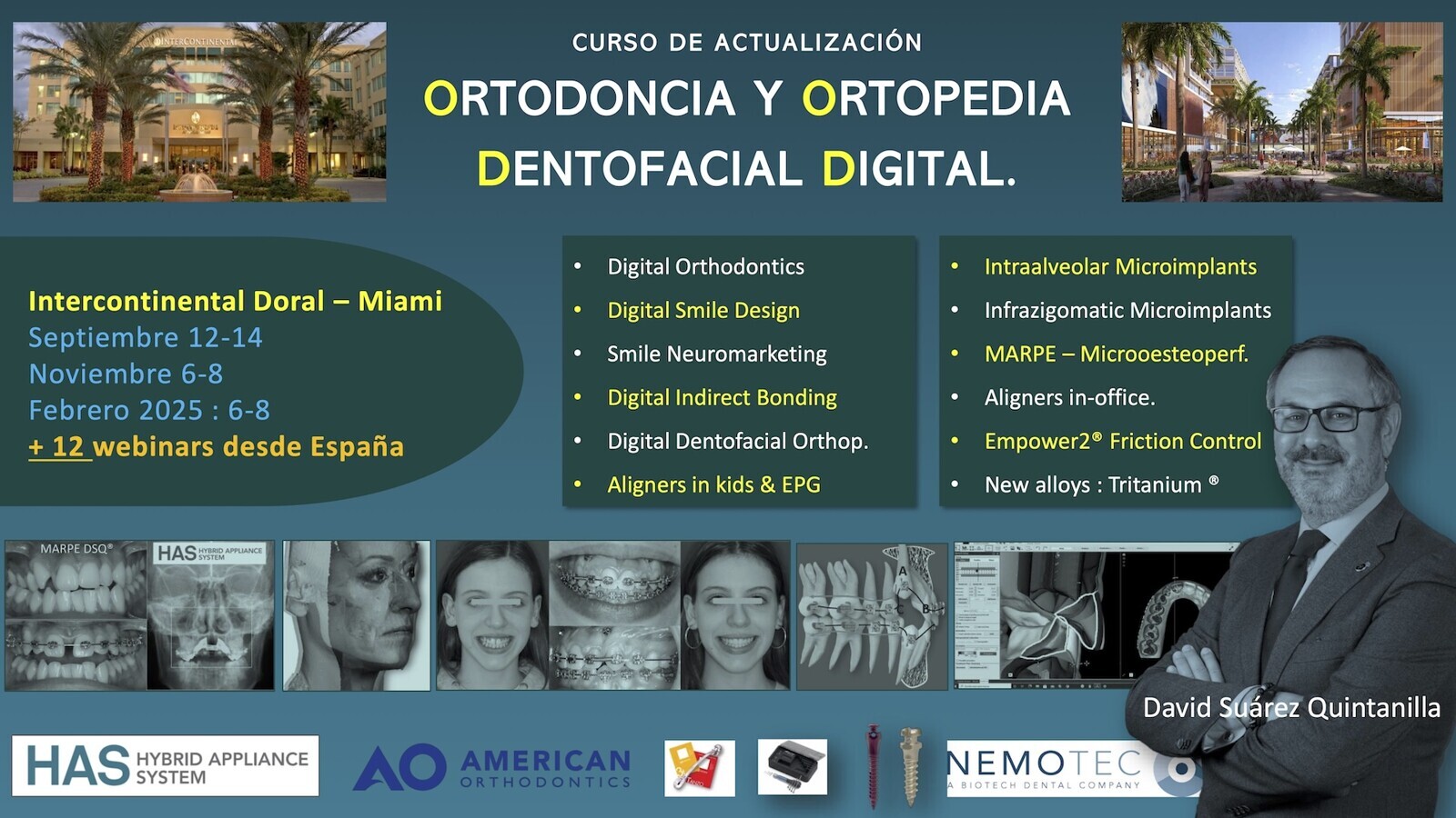El Profesor y Doctor David Suárez Quintanilla, Catedrático de Ortodoncia de la Universidad de Santiago de Compostela (USC), Titular de la Real Academia de Medicina de Galicia, expresidente de la European Orthodontic Society y exvicepresidente para Ortodoncia de la International Association for Dental Research, ha diseñado un extraordinario curso de actualización en ortodoncia y ortopedia dentofacial digital, el cual se impartirá en Miami.