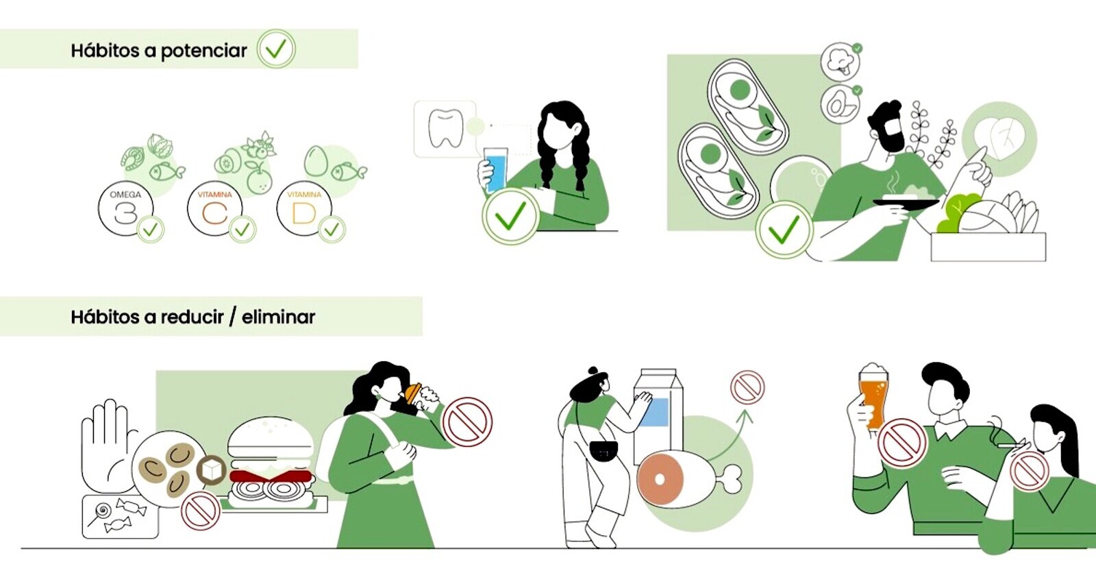 El exceso de productos proinflamatorios en la dieta, como los azúcares refinados o las grasas saturadas, está relacionado con la inflamación local y sistémica. Sin embargo, una dieta baja en estas sustancias, y rica en alimentos con ácidos grasos omega-3, vitamina C y D y micronutrientes derivados de fruta y verdura, contribuye a reducir la inflamación.