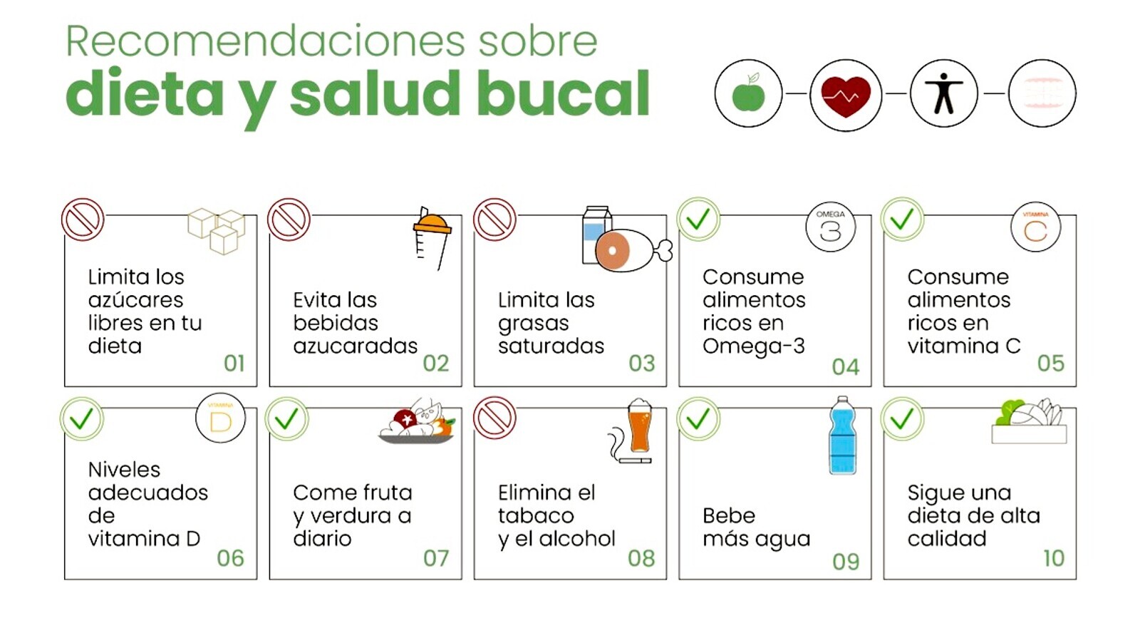 Una dieta desequilibrada influye negativamente en las enfermedades bucodentales, y una mala salud bucal afecta negativamente también a la salud general. Ante esta situación, se aconseja adoptar una serie de medidas básicas en cuanto a la alimentación, muchas de ellas ya conocidas pero que son sintetizadas, argumentadas científicamente y explicadas de forma sencilla por los autores del informe, aportando también información útil sobre el impacto sobre la salud bucal de cada medida sugerida. Como recomendaciones, se indica lo siguiente: