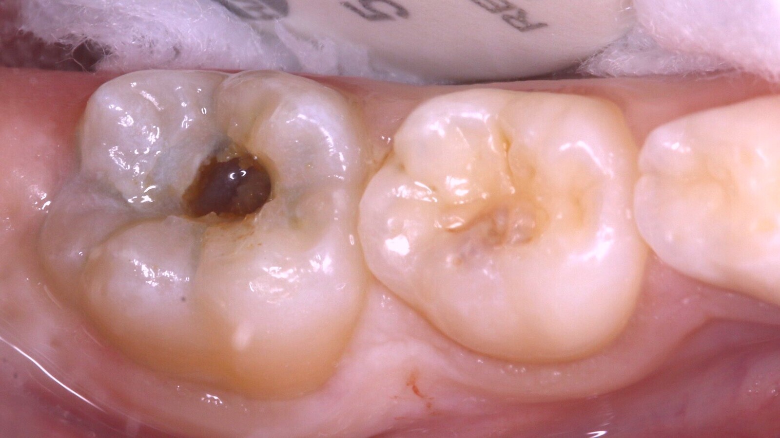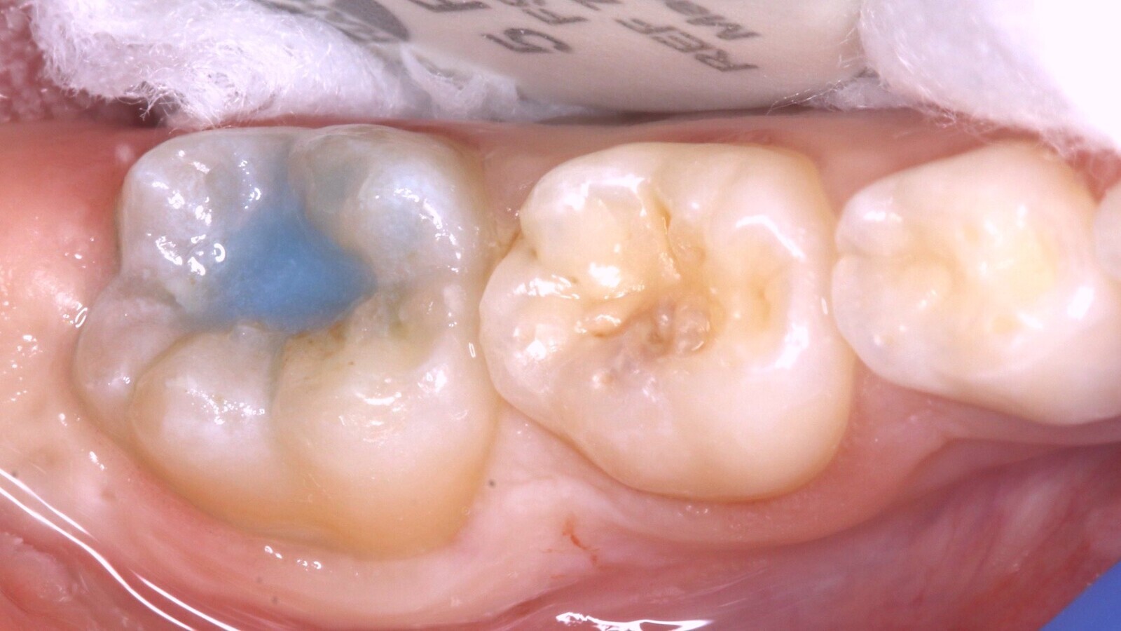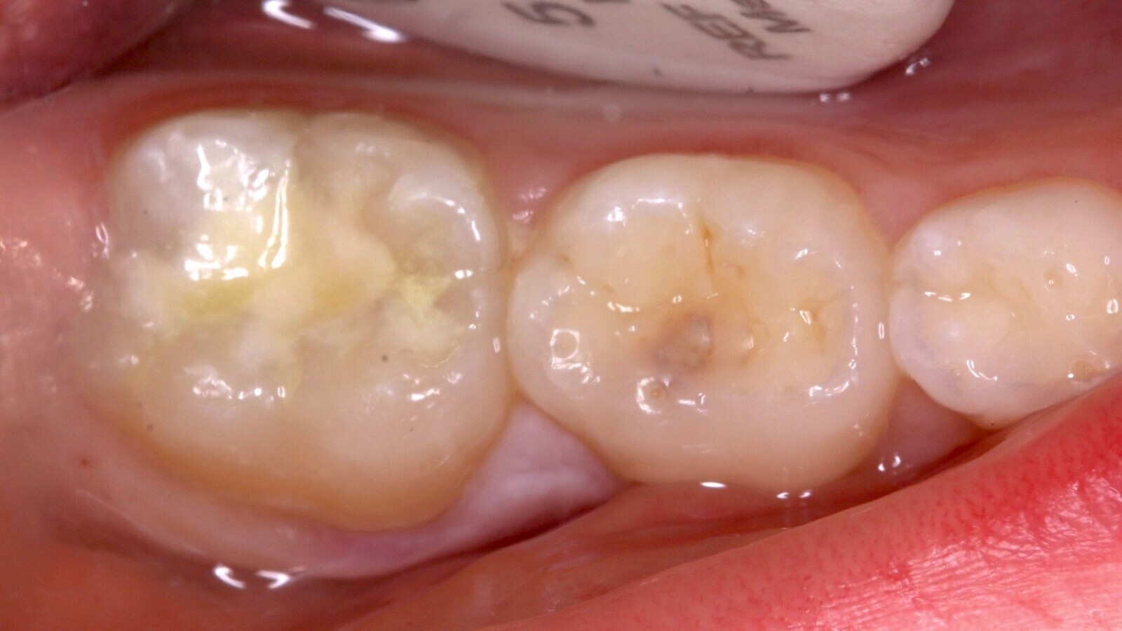 Al realizar el examen clínico, el diente 46 presenta una sombra subyacente en la dentina apreciada desde oclusal (Fig. 1), que al manejar el sistema internacional de detección y valoración de caries dental se considera una lesión ICDAS 4 (sombra subyacente en la dentina con esmalte aparentemente intacto). El examen radiográfico, con una exposición de aleta de mordida, evidencia una imagen radiolúcida que alcanza al tercio medio de la dentina (Fig. 2).
