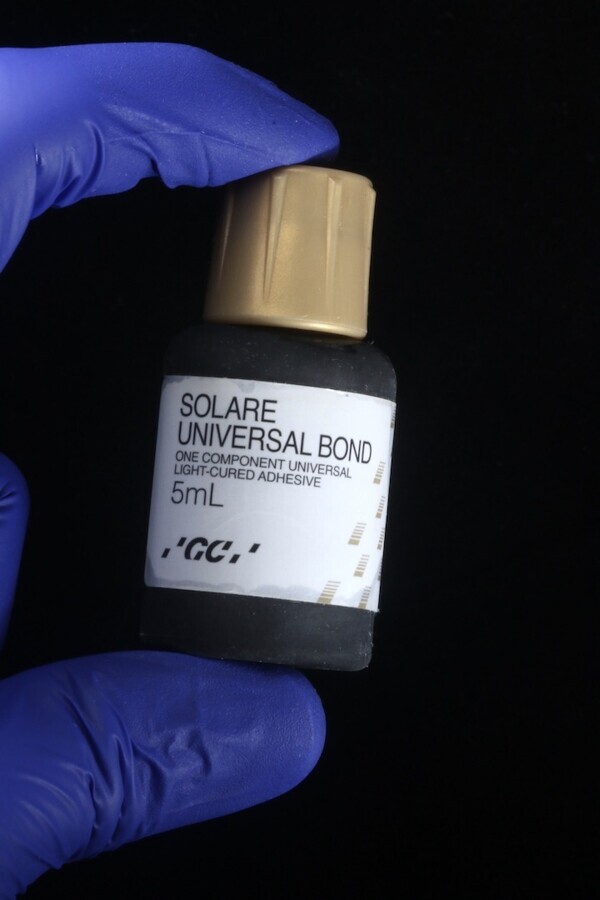 De utilizar un sistema adhesivo universal o de tipo total etch: condicionamiento de esmalte y dentina por 15 segundos, lavado y secado y aplicación del adhesivo frotando enérgicamente en dentina y suavemente en esmalte, evaporar solventes con aire y fotopolimerizar por 40 segundos (una capa de resina fluida sería recomendable como resin coating)
