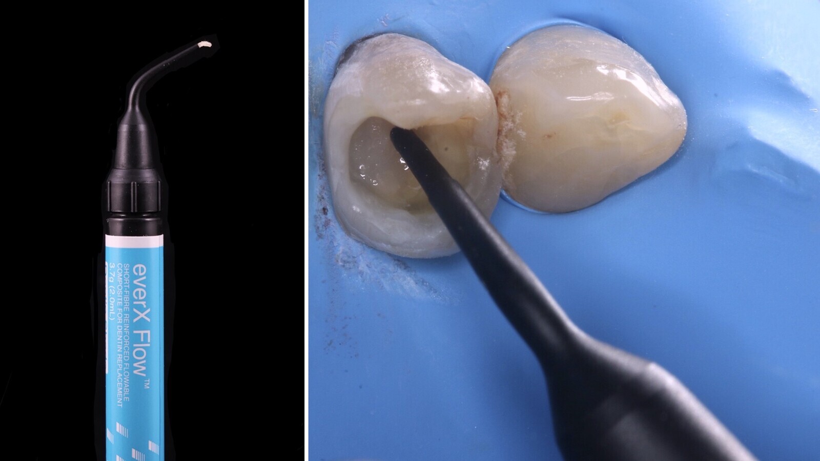 Innovaciones como el uso de fibras trenzadas de polietileno se han propuesto como un sustituto dentinario; sin embargo, son sensibles a la técnica y habilidad del operador. Y a pesar de estar presentes en el mercado por más de una década, no poseen suficiente evidencia clínica longitudinal que los respalde. Recientemente, se han lanzado al mercado latinoamericano un material a base de resina reforzadas con fibras discontinuas o cortas (EverX, GC Corporation) diseñados para usarse como material de restauración que soporte tensión y que supere la tenacidad de los materiales resinosos directos, especialmente en casos de grandes cavidades de dientes posteriores vitales y no vitales. Este material consiste en una combinación de una matriz de resina, fibras de vidrio E orientadas aleatoriamente y rellenos de partículas inorgánicas, que brindan excelentes propiedades de unión y mejoran la cohesión de la matriz polimérica. La resina reforzada por fibras cortas ha demostrado una tenacidad a la fractura (2,4 MPa), resistencia a la flexión (124 MPa) y módulo de flexión (12,6 GPa), significativamente mayores que todos los demás materiales de resina comparables como sustitutos dentinarios o de reconstrucción de núcleos. El efecto de refuerzo de los rellenos de fibra yace en la transferencia de tensión de la matriz polimérica a las fibras, al igual que en el comportamiento de las fibras cortas individuales como amortiguadores de la tensión de polimerización, fisuras o cracks.