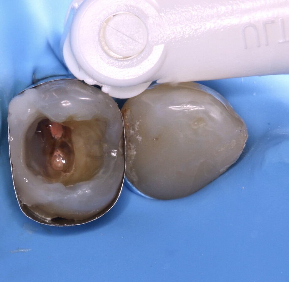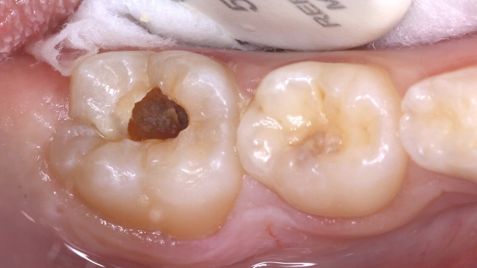 Fig. 7. Remoción selectiva del tejido cariado con una estrategia químico-mecánica hasta llegar a dentina firme.