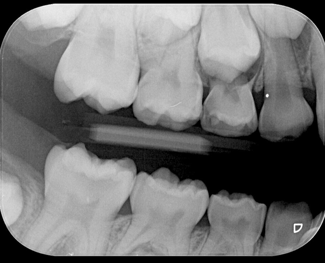 Fig. 14. Caries secundaria alrededor de una restauración con resina en las superficies oclusal y distal en un diente tratado endodónticamente (primer premolar superior izquierdo, diente 24).