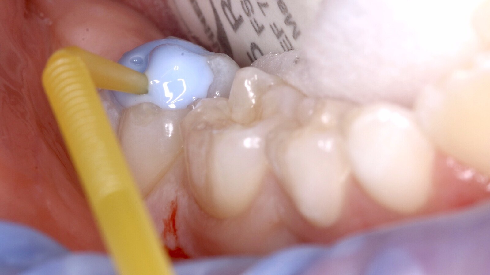 Antes de proceder con la limpieza de la cavidad, se toma una impresión de la anatomía con un material de barrera gingival (Gingival Barrier, SDI Ltd.) fijado en un micro-aplicador (Fig. 4), de forma que se pueda copiar la anatomía existente mediante la técnica del estampado oclusal (Fig. 5). Tras realizar la apertura de la cavidad (Fig. 6) se inicia la remoción selectiva del tejido cariado con una estrategia químico-mecánica (Fig. 7) hasta llegar a DENTINA FIRME en la base y dura en la periferia de la cavidad (Fig. 8) bajo aislamiento relativo utilizando Optragate (Ivoclar Vivadent) y rollos de algodón, se procede a aplicar el material restaurador EQUIA Forte fil (Fig. 9).
