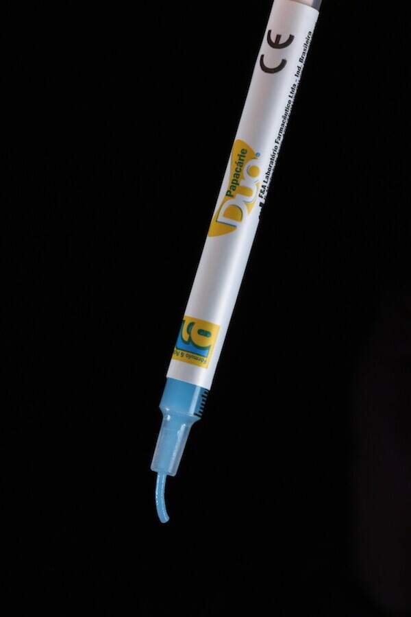 Por la severidad de la lesión, sin una cavidad evidente, se decide realizar una remoción de esmalte con alta rotación utilizando fresas diamantadas con la finalidad de acceder a la dentina cariada con instrumentos manuales, complementados con un agente enzimático a base de papaína (Papacarie Duo, Formula & Ação) (Fig. 3).