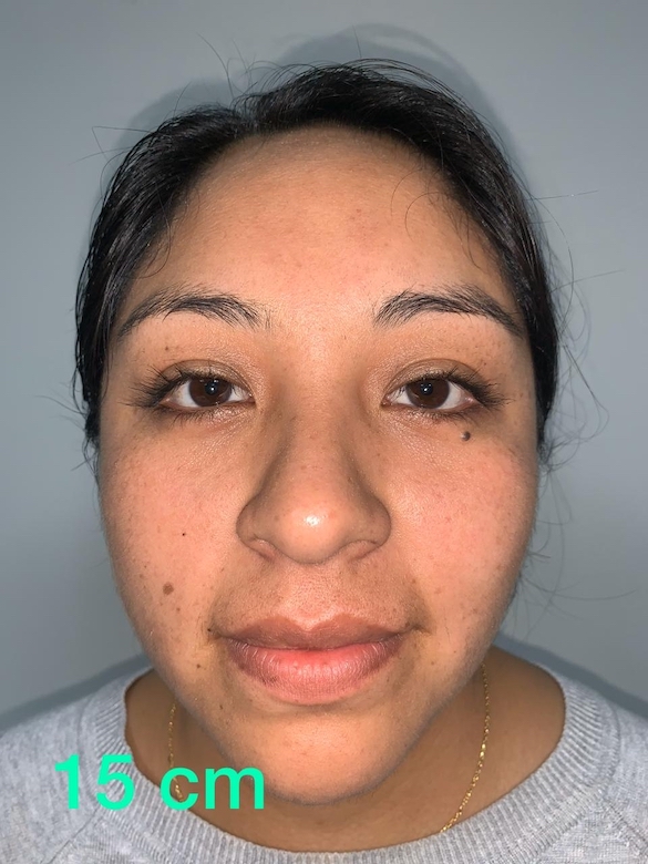 Foto 6. Distancia ideal. Es la toma a una foto a una distancia ideal entre las medidas más cercanas y más lejanas, donde el paciente afirma que “esa sí es su cara real”, sin distorsión alguna y con una iluminación más natural.