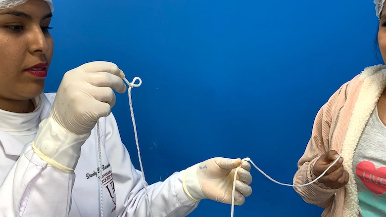 Una vez medida la distancia de la distorsión proximal, pedimos al paciente que continúe agarrando el nudo del extremo de la cuerda y empezamos a retroceder hasta encontrar la distorsión distal. Estiramos la cuerda, hacemos otro nudo en esa posición y medimos (Foto 4).