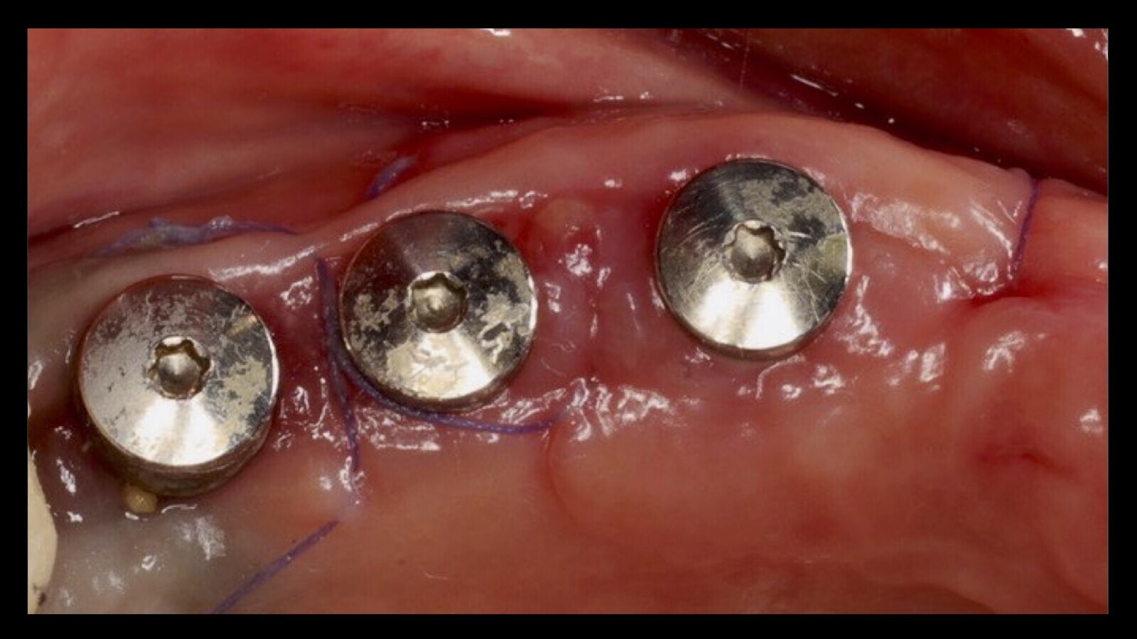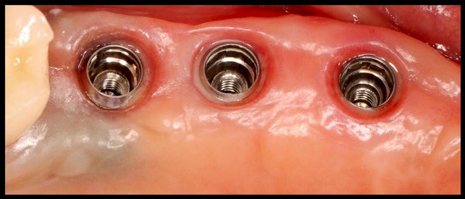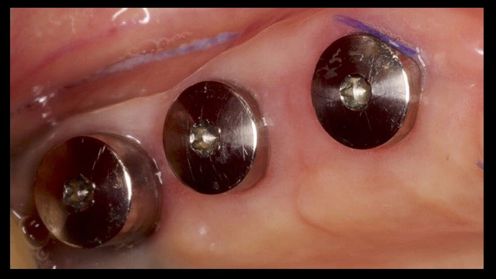 Figura 1.Colocación de implantes en el maxilar superior de un paciente 79 años con deficiencia vitamina D. Se comienza tratamiento prequirúrgico con vitamina D de 0266 mg cada 7 días por 3 meses en este caso clínico realizado por Dr. Iván Herrera Ustariz.