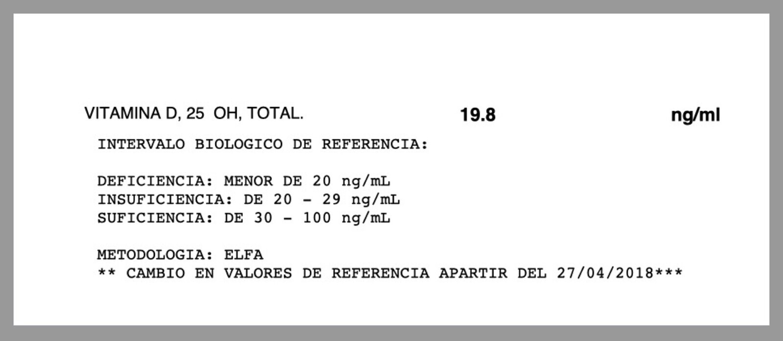 Tabla 1. El examen de vitamina D de la paciente muestra que tiene deficiencia en su nivel sérico.