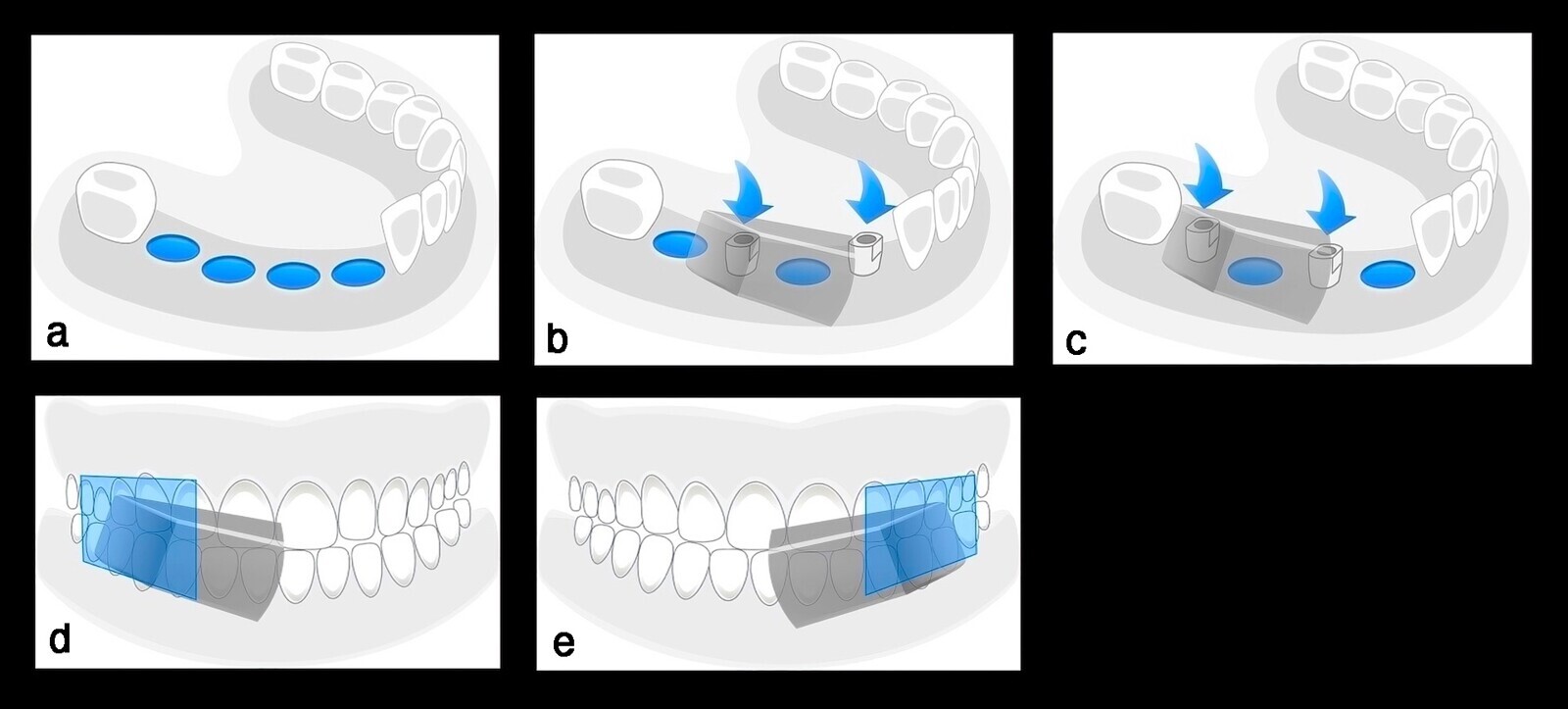 Figura 4. Escaneado de múltiples implantes. Escanear los implantes sin los tapones (a, b) y bloquear los sitios de los implantes utilizando la herramienta del software para borrar con círculos (c). Posteriormente, escanear el resto de los dientes de la arcada y los tejidos periodontales (d, e). Recuerde que el escáner no debe entrar en contacto con los dientes. Imagen: SHINING 3D