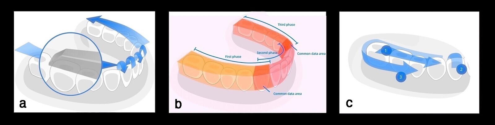 Figura 1. Técnica de escaneado universal. Comenzar por la cara oclusal del último molar del lado escogido (a), seguir por las caras oclusales de un lado a otro como se indica en la imagen (b), girar después el escáner hacia lingual o palatino y escanear las caras de los dientes y tejidos periodontales para obtener imágenes de alta calidad (c). Imagen: SHINING 3D