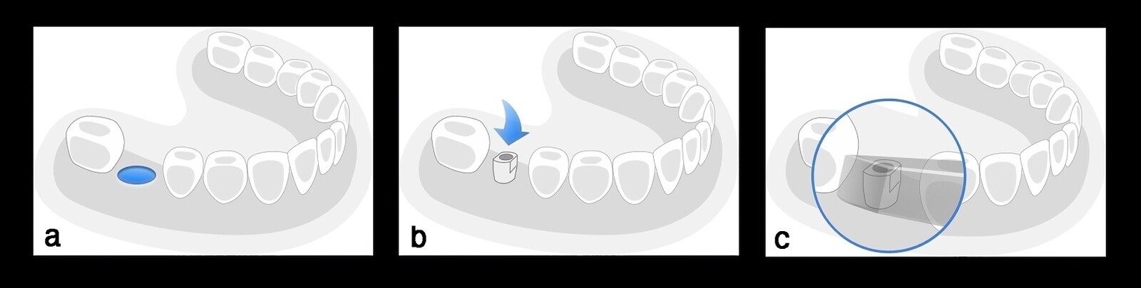 Figura 3. Escaneado de implante único. La técnica para la toma de impresión de un implante individual consiste en escanear el implante sin tapón (a), instalar el pilar de escaneo (b) y realizar la toma impresión (c), tras lo cual se toma el registro de la oclusión. Imagen: SHINING 3D