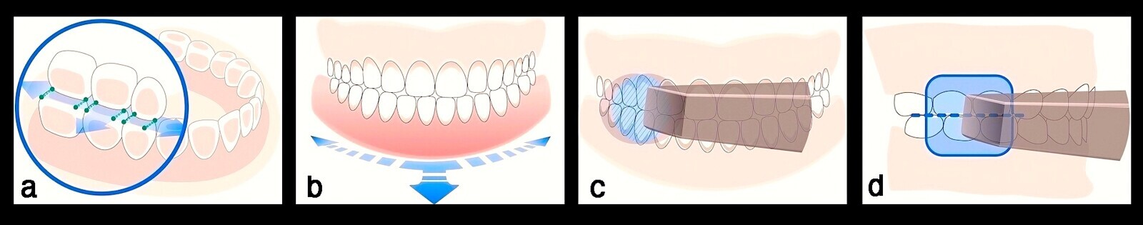 Figura 2. Escaneado de oclusión dinámica. Posicionar la punta del escáner en un punto fijo para captar la oclusión (a). Dejar la punta estática y pedir al paciente que haga movimientos de protrusión (b) y lateralidad de la mandíbula, teniendo en cuenta que estas imágenes deben superponerse (c) y que la punta del escáner debe estar centrada entre la mandíbula superior y la inferior (d). Imagen: SHINING 3D