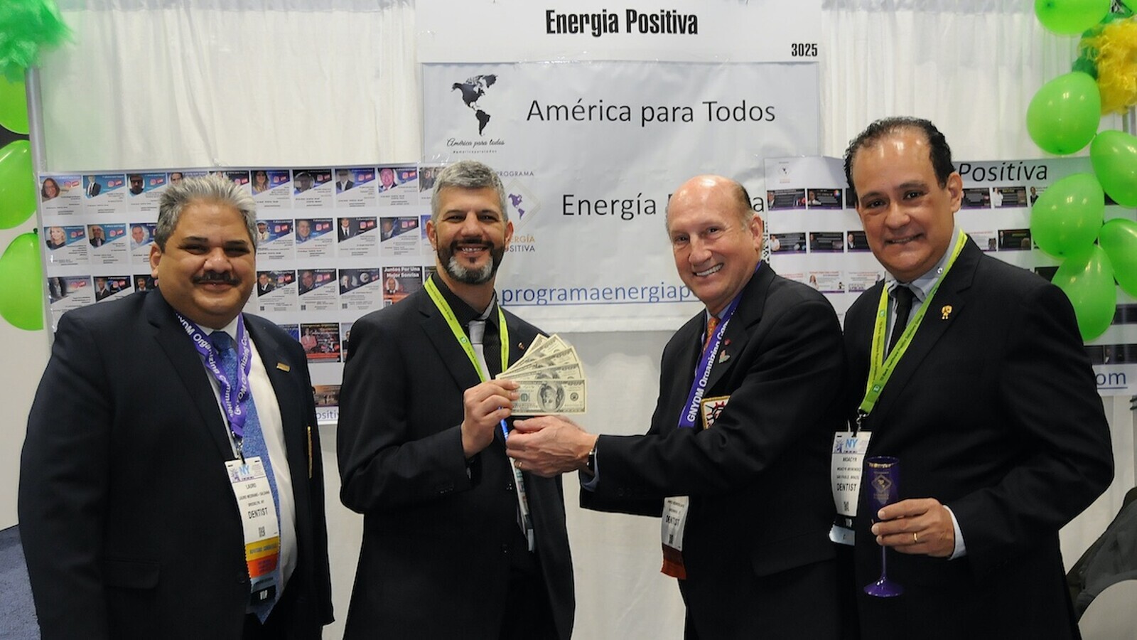 El Dr. Rafael Mejicano Soto recibe a nombre de su padre, Dr. Rafael Mejicano Díaz, 500 dólares del Dr. James Doundoulakis, presidente del Greater New York Dental Meeting, que se ganó en una rifa entre los asistentes hispanos al congreso de Nueva York. Junto a ellos aparecen los doctores Lauro Medrano (izquierda) y Moacyr Menéndez (derecha).