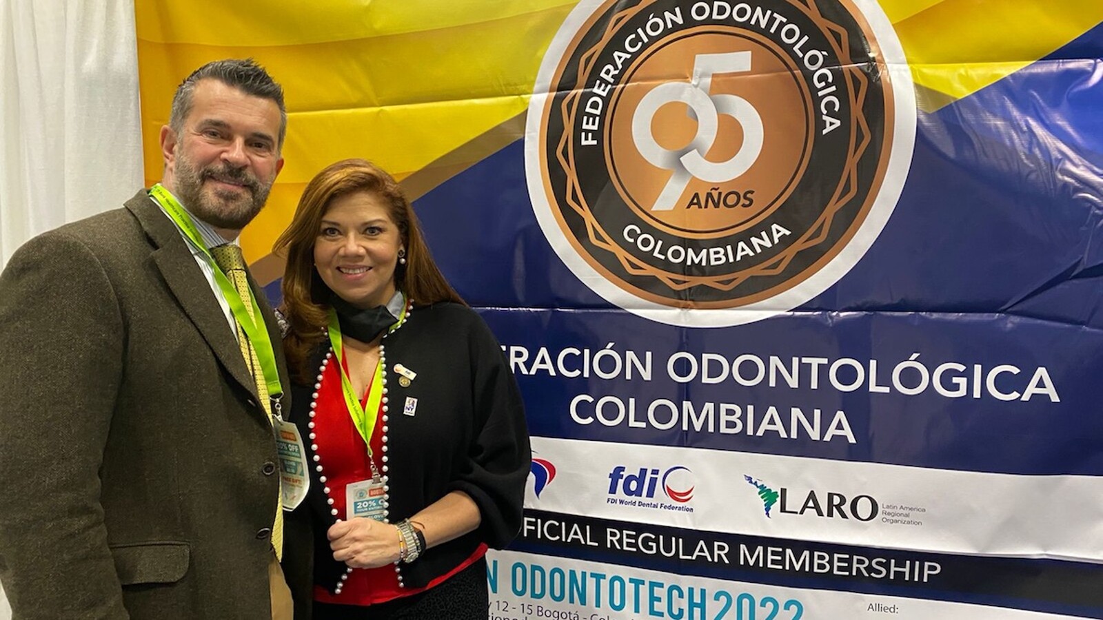 La Dra. María Fernanda Atuesta, Presidenta de la Federación Odontológica Colombiana, con Enzo Bondioni, Director ejecutivo de FDI.