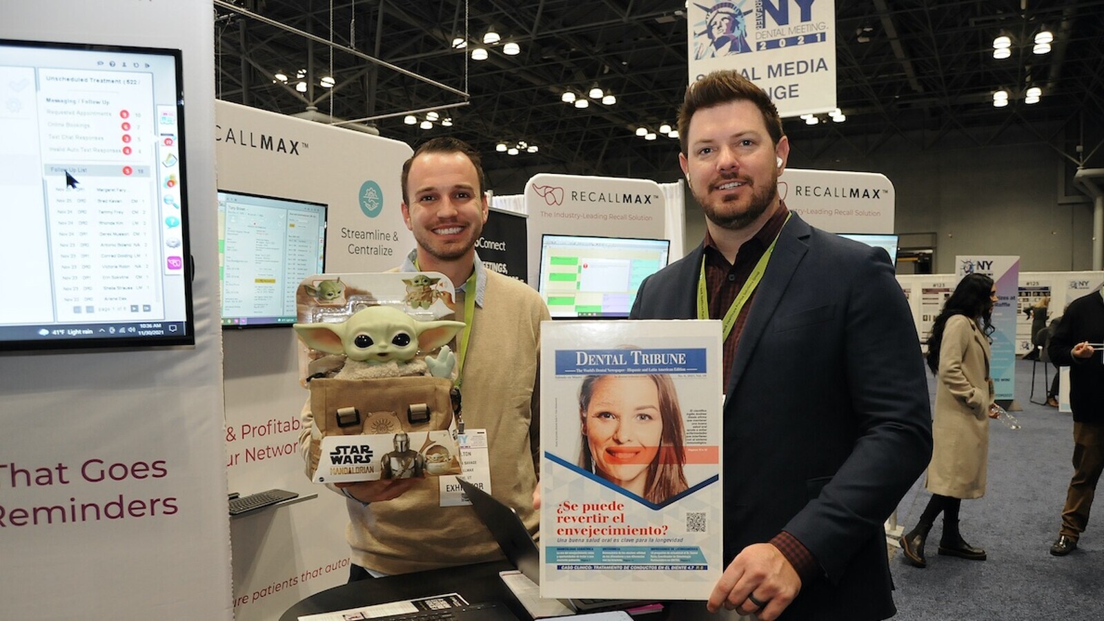 Alex Malone y Kolton Savage de la compañía Recallmax, con una edición reciente de Dental Tribune.