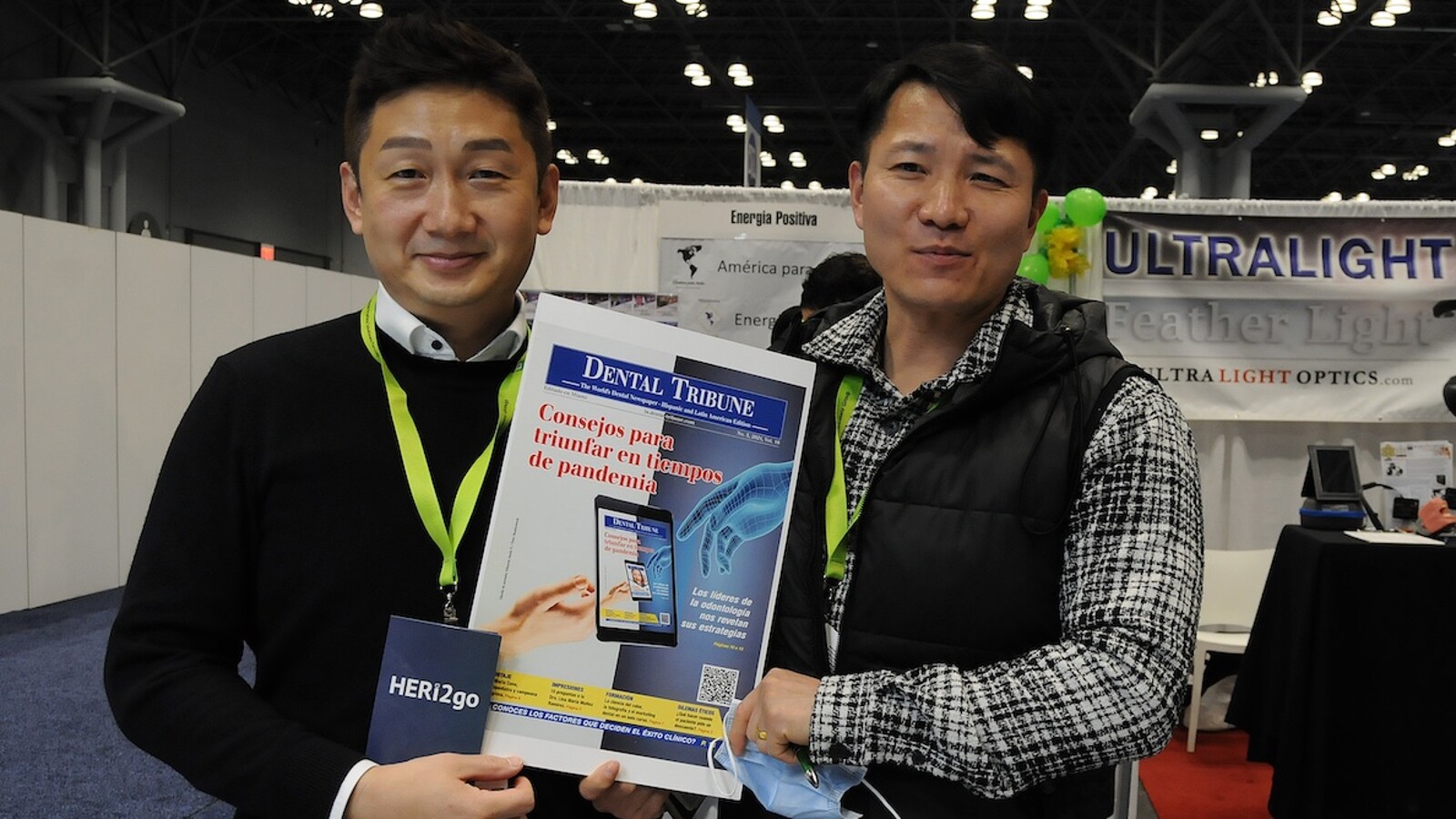 Jinyong Yoo y Jeff de la empresa HERIBio, que desarrolla tecnologías basadas en Inteligencia Artificial y Aprendizaje Profundo para el sector médico, pidieron un ejemplar de Dental Tribune.