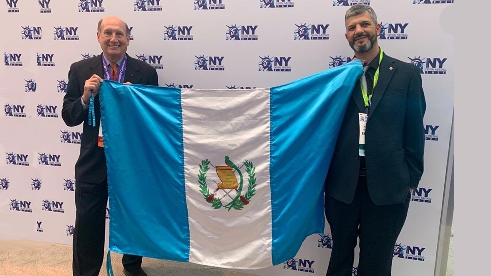 El Presidente del GNYDM, Dr. James Doundoulakis (izquierda), con el Dr. Rafael Mejicano Soto y la bandera de Guatemala. Mejicano impartió una conferencia en Nueva York basada en su investigación in vitro sobre la corrección de la angulación en los tornillos de los pilares de prótesis implantadas.